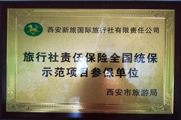 授予稱(chēng)號(hào):旅行社責(zé)任保險(xiǎn)全國(guó)統(tǒng)保示范項(xiàng)目參保單位