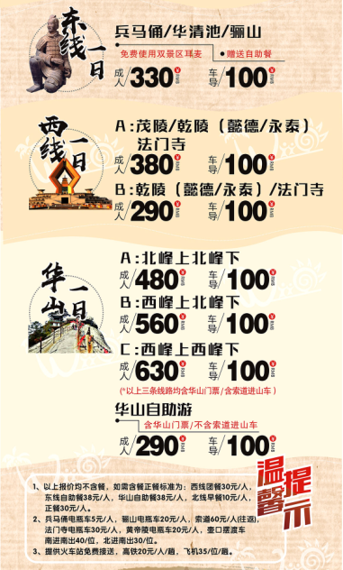 我們堅(jiān)持遵循:以質(zhì)量求生存、以創(chuàng)新求發(fā)展、以市場為導(dǎo)向、以服務(wù)為宗旨的經(jīng)營理念,為游客提供全方位、多元化、高層次的服務(wù)。 感謝各位對西安新旅國際旅行社的支持!