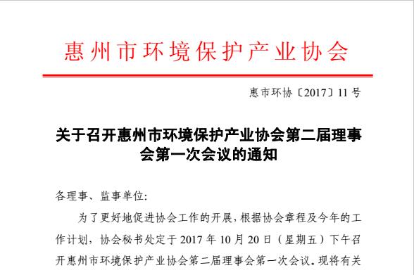 為了更好地促進協(xié)會工作的開展,根據(jù)協(xié)會章程及今年的工 作計劃,協(xié)會秘書處定于 2017 年 10 月 20 日(星期五)下午召開惠州市環(huán)境保護產(chǎn)業(yè)協(xié)會第二屆理事會第一次會議。廣東綠維環(huán)保工程有限公司應(yīng)邀參加。
