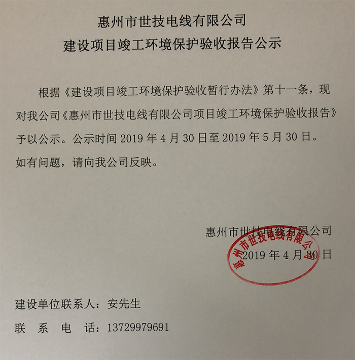 惠州市世技電線有限公司建設(shè)項(xiàng)目竣工環(huán)境保護(hù)驗(yàn)收?qǐng)?bào)告公示