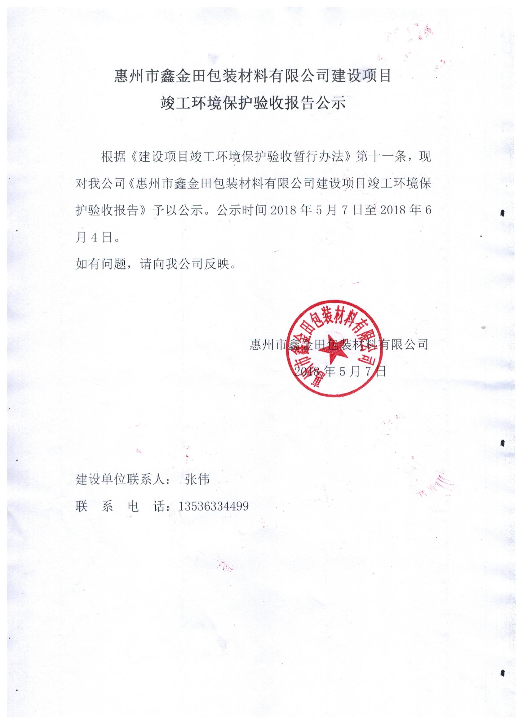 惠州市鑫金田包裝材料有限公司項(xiàng)目自主驗(yàn)收監(jiān)測(cè)調(diào)查報(bào)告